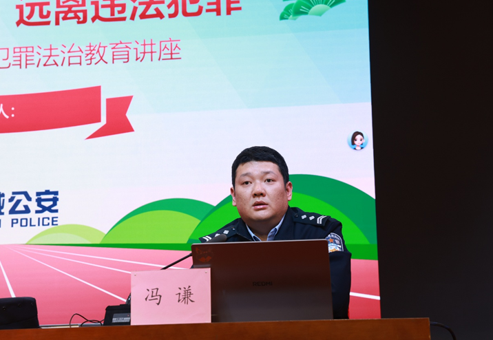 本次活动特邀永乐派出所冯谦警官莅临开展法制专题讲座。冯警官紧扣青少年成长特点,围绕交通安全、反邪教、防电信诈骗、校园安全、法治意识培养五大核心内容展开宣讲。结合违规骑乘电动车、网络沉迷、校园欺凌、游戏交易诈骗等贴近学生生活的典型案例,用通俗的语言剖析法律后果,深入讲解《未成年人保护法》《预防未成年人犯罪法》相关知识。讲座中,冯警官通过互动问答、情景分析等形式,引导学生明辨是非、敬畏法律,掌握自我保护技巧,牢记“未满16周岁不得驾驶电动车”“不轻信、不透露、不转账”等安全要诀。现场掌声不断,同学们在沉浸式学习中深化了法治认知,筑牢了安全防线。