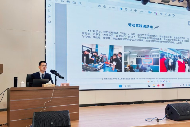 董鹏副院长在报告中系统阐释了陕西交通技师学院在育人管理与招生宣传方面的创新理念与实践体系。他指出,技工院校的高质量发展必须立足立德树人根本任务,构建“管理为基、文化为魂、传播为翼”的协同育人格局。在管理层面,学院通过实施专业化、闭环式的半军事化管理模式,筑牢校园安全防线,为学生成长营造稳定有序的环境;在文化育人方面,学院以品牌活动为载体,推动学生行为养成与心理健康教育深度融合,实现从“管得住”向“育得好”的转变;在招生宣传方面,学院积极拥抱新媒体浪潮,打造“直播带校”“大咖助力”“全员动员”三位一体的招生新生态,实现职业教育品牌声量与实效的双重提升。