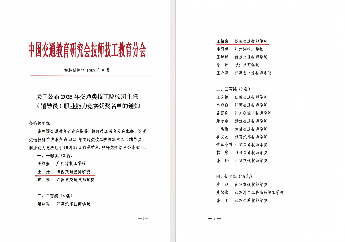 2025年10月24日至25日,由中国交通教育研究会技工教育分会主办的2025年全国交通类技工院校班主任(辅导员)职业能力竞赛决赛圆满落幕。在这场全国性的高水平赛事中,来自全国18所交通类技工院校的33名优秀班主任展开激励角逐,陕西交通技师学院选派的两位班主任脱颖而出、表现卓越,王浩老师荣获一等奖,王怡鑫老师荣获二等奖,充分展现了学院班主任队伍深厚的育人功底和卓越的职业风采。